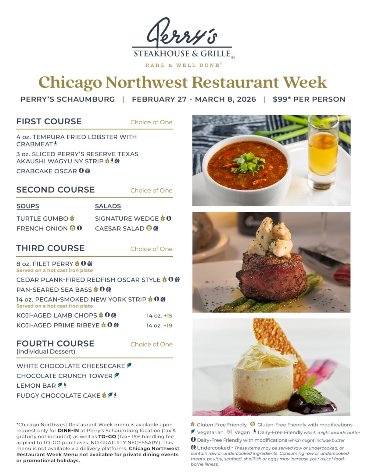 *Chicago Northwest Restaurant Week menu is available upon request only for DINE-IN at Perry’s Schaumburg location (tax & gratuity not included) as well as TO-GO (Tax+ 15% handling fee applied to TO-GO purchases.