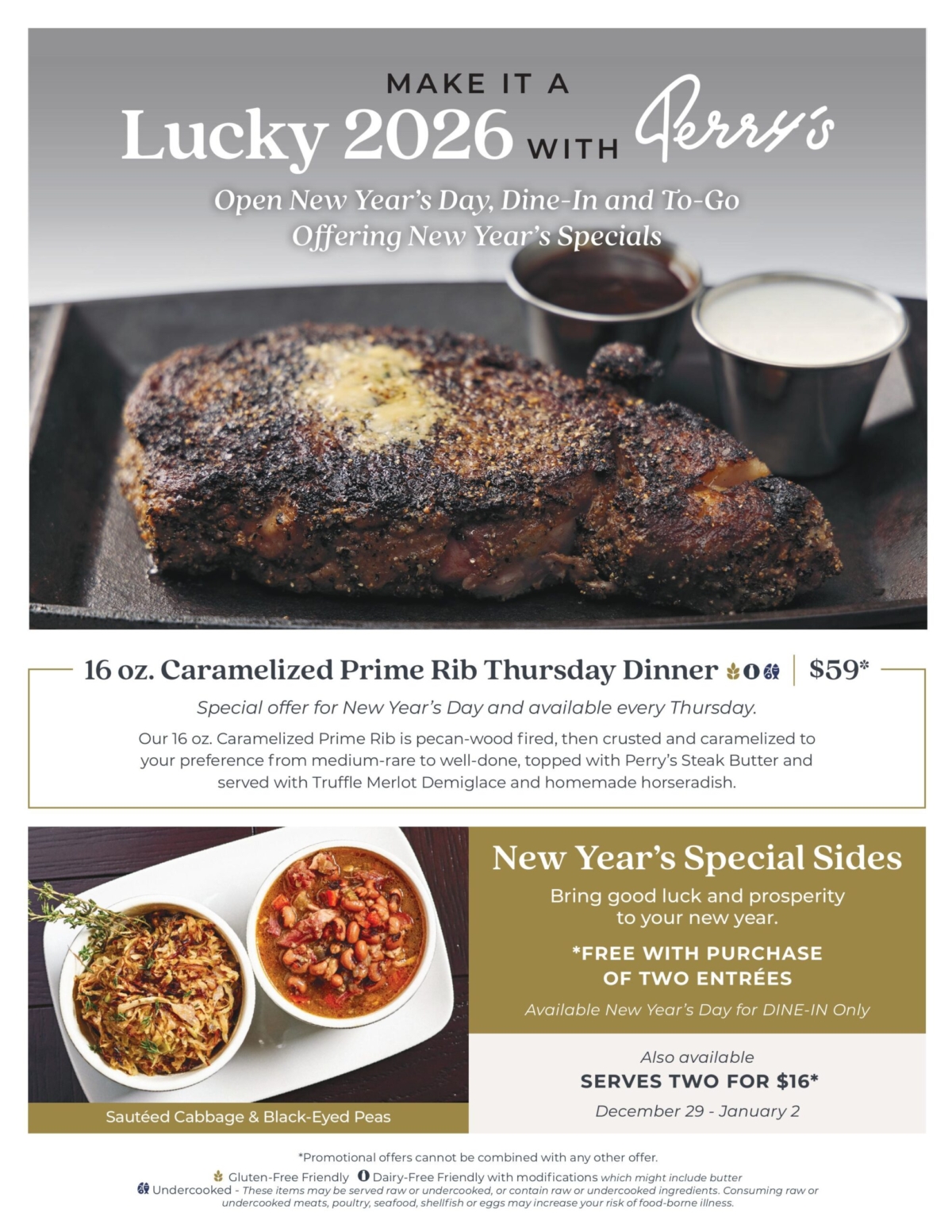 Open New Years Day, Including New Year's Special Sides & Our 16 oz. Caramelized Prime Rib Thursday Dinner