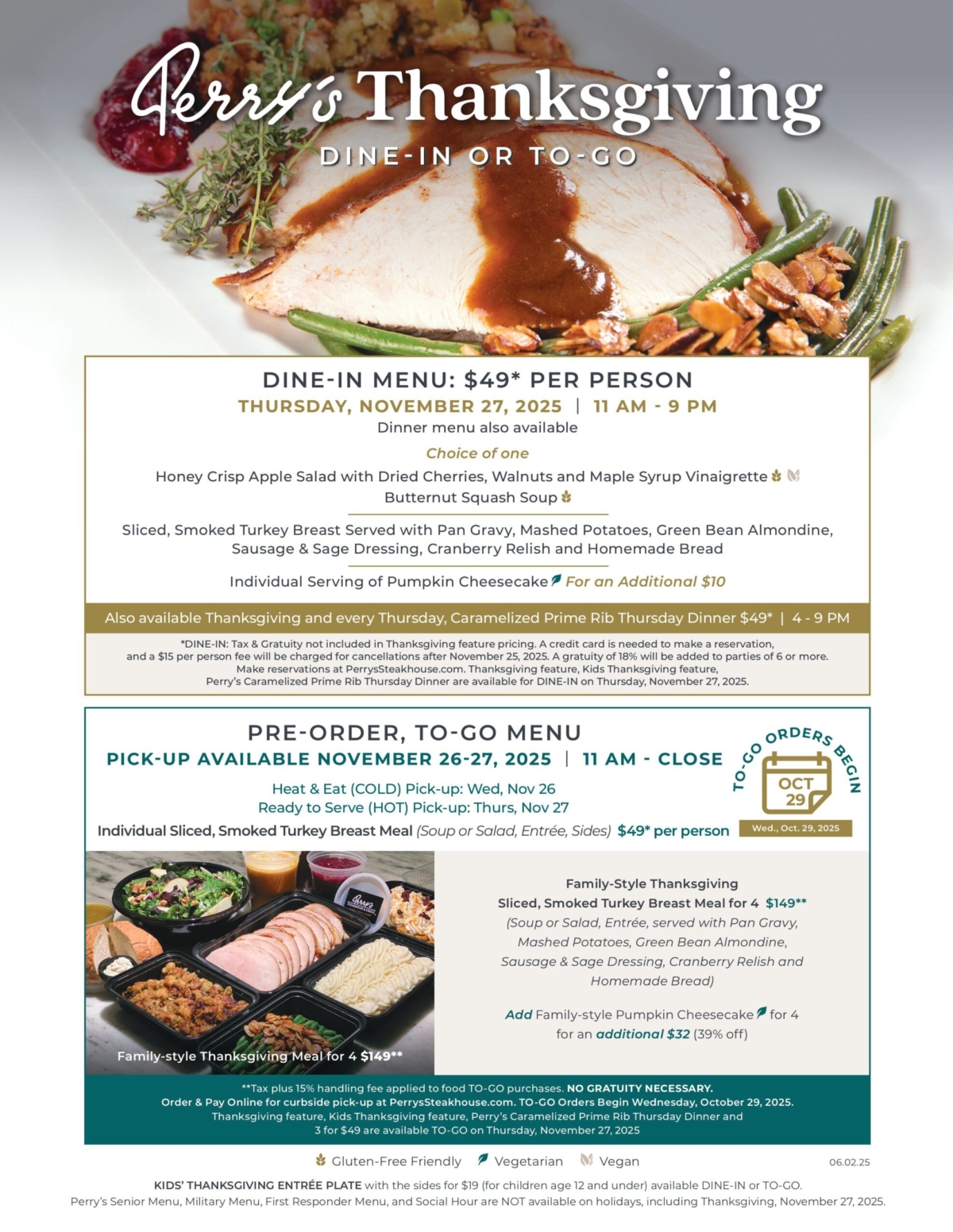 Dine in on Thursday, November 27th (11am-9pm) and enjoy our $49 Thanksgiving menu, $49 Caramelized Prime Rib (4pm-9pm) or pre-order your choice of our Thanksgiving options for pick-up on Nov 26-27.